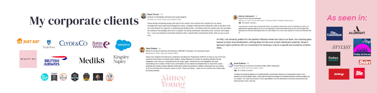 "Aimee was integral to the Women’s Leadership Development Programme at British Airways as one of the key coaches to the cohort of female future leaders. Aimee delivered a number of coaching sessions for the delegates, with a focus on empowerment and career goals. Feedback from the delegates has been astounding and a number of them have commented on how Aimee has helped them to reach their career potential and create a clearly defined career path. Aimee successfully created a safe space for our women to thrive and bring their authentic selves to work."