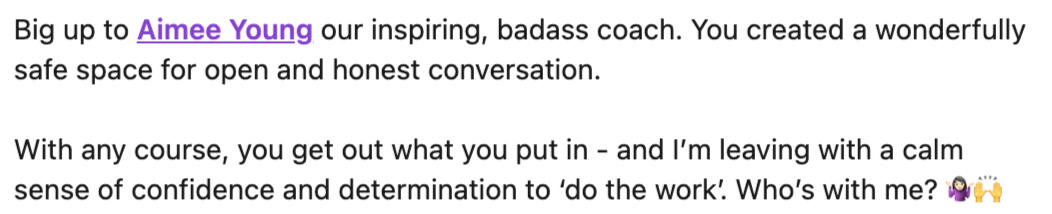 "It brings me immense pleasure to wholeheartedly recommend Aimee as an exceptional coach. In my capacity as HRD at Bates Wells, I have had the distinct privilege of witnessing Aimee's profound impact on our people. Her coaching prowess is truly unparalleled, and her dedication to personal and professional development is awe-inspiring. It's noteworthy that Aimee's reputation among those she has coached is so stellar that they enthusiastically recommend her to their colleagues and acquaintances. This word-of-mouth endorsement speaks volumes about the value she brings to the table."